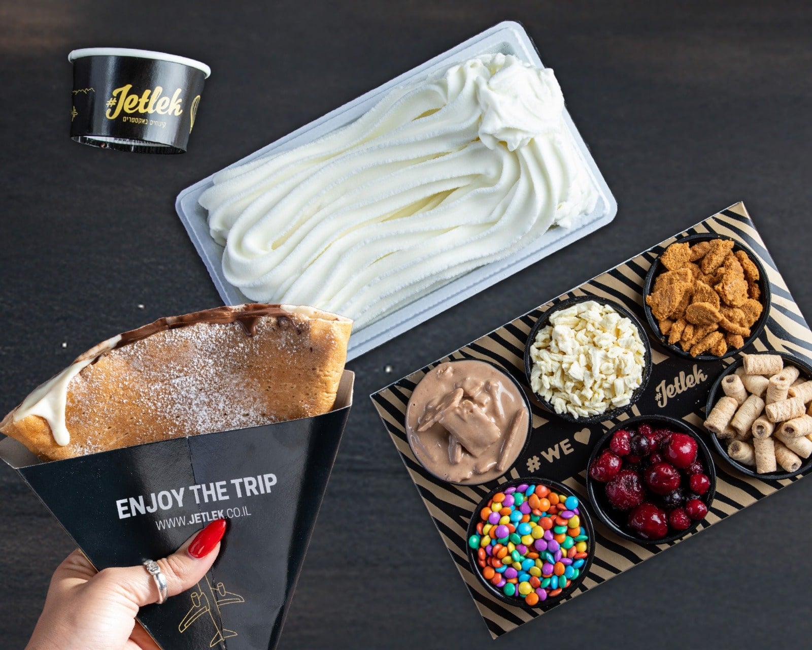 קרפ בלווי שוקולד חום אגוזים ולבן + חצי ליטר יוגורט + 4 תוספות